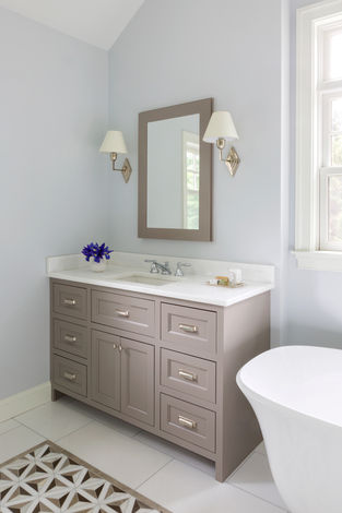 Designed as part of a new addition, this luxe and serene master bath room boasts soaring ceilings, dual vanities
