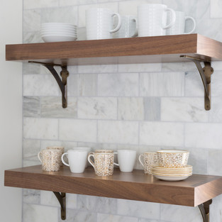 Aesthetically we kept the look clean and classic with an updated twist. We provided custom inset cabinetry in a light grey paired them with medium brown oak floors and white, black and walnut counters. We used a honed black granite on the perimeter and a stunning Calcutta Michelangelo marble with a "waterfall" style that rungs down the sides of the island. A few fun cabinetry details include, appliance garage tucked behind antique mirrored doors, a coffee zone with floating walnut shelves and a walnut command center off of the mudroom. Last but not least we created a beverage center with two small refrigerators (wine and beverage) and a petite sink.