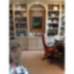 Also to the left of the entry is Mr. Jefferson Drive's office. We kept renovations to a minimum here, keeping the existing built-ins but upgrading them with paint, new glass shelves and walnut veneer applied to the backs. Add a statement modern light fixture, a custom desk with legs engineered to hide cords and cables, and a vintage rug and you have one stylish workspace. Bonus points if you spotted the grasscloth wallcovering we added to the ceiling. We love the warmth of grasscloth, and used it in many rooms- and ceilings- in this home.